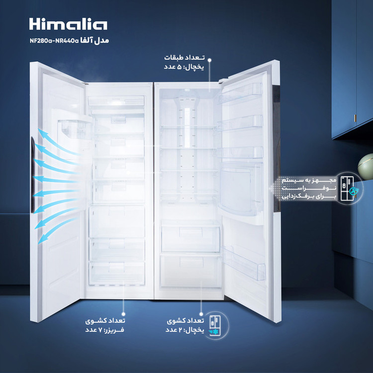 یخچال فریزر دوقلو 17 فوت هیمالیا مدل آلفا NF280a-NR440a، دارای نمایشگر و بدون برفک، با ارتفاع 192، پهنای 130 و عمق 70 سانتی متر، میزان مصرف انرژی B، دارای 5 طبقه در یخچال و 8 کشو در فریزر