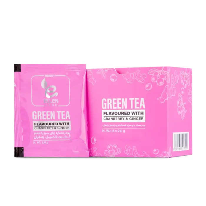 پودر عصاره چای سبز با طعم کرنبری، زنجبیل و زعفران الن کر بسته 15 عددی
