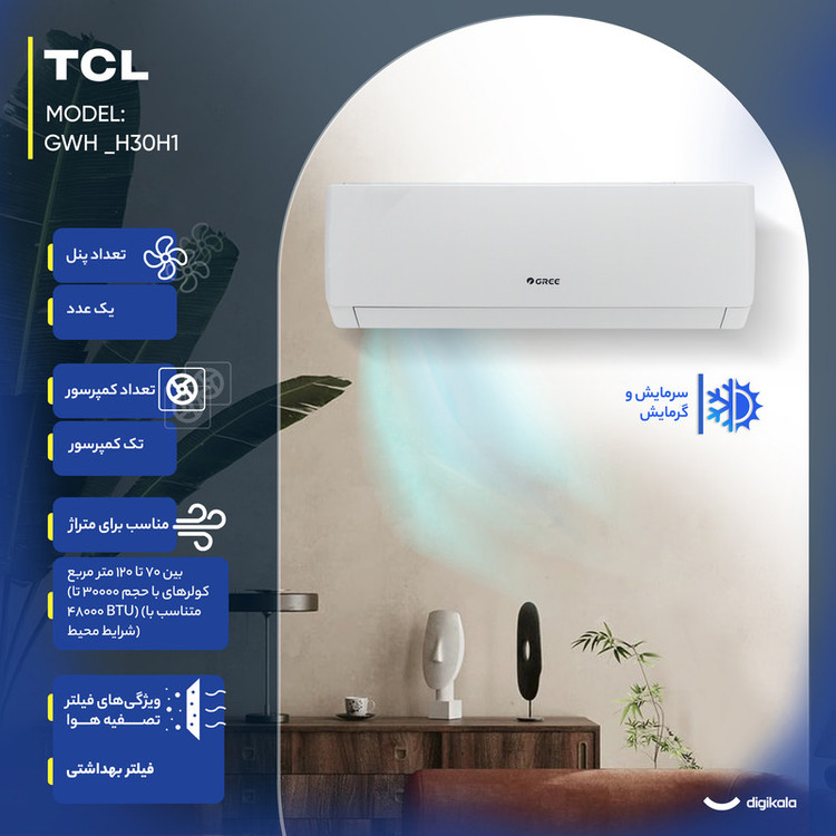نمایشگر دیجیتال روی ریموت , کنترل کامل تنظیمات دما و فن , تنظیم جهت پرتاب باد از راه دور , قابلیت تنظیم حالت توربو از ریموت , طراحی ارگونومیک و سبک